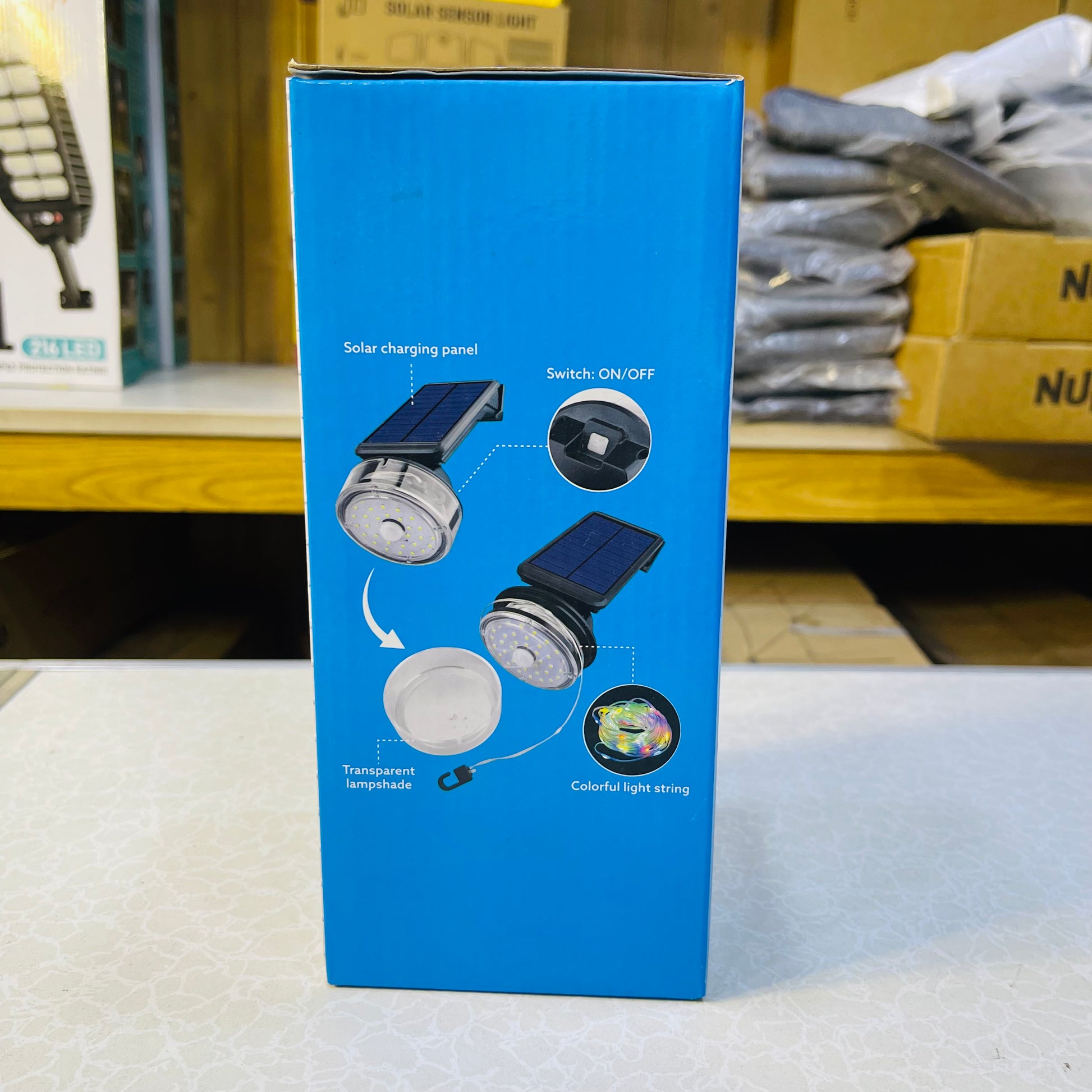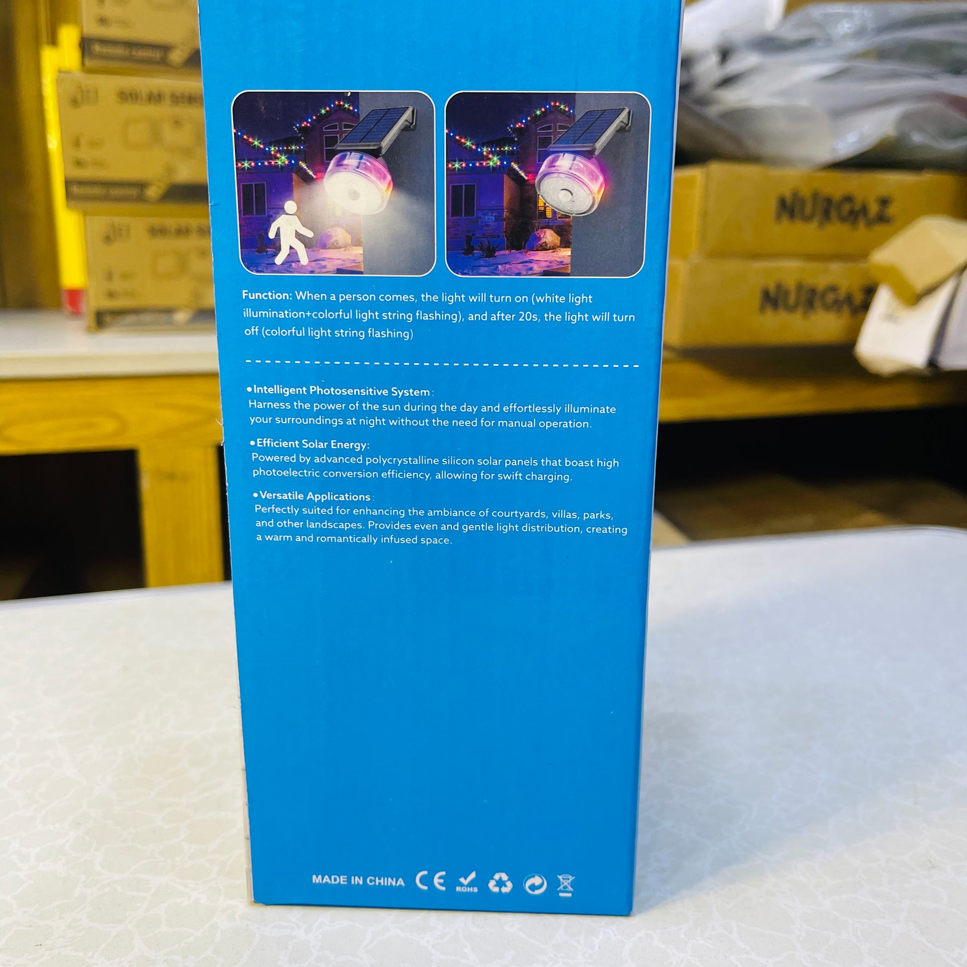 - Auto Night Operation – white light activates on motion, colorful lights flash continuously